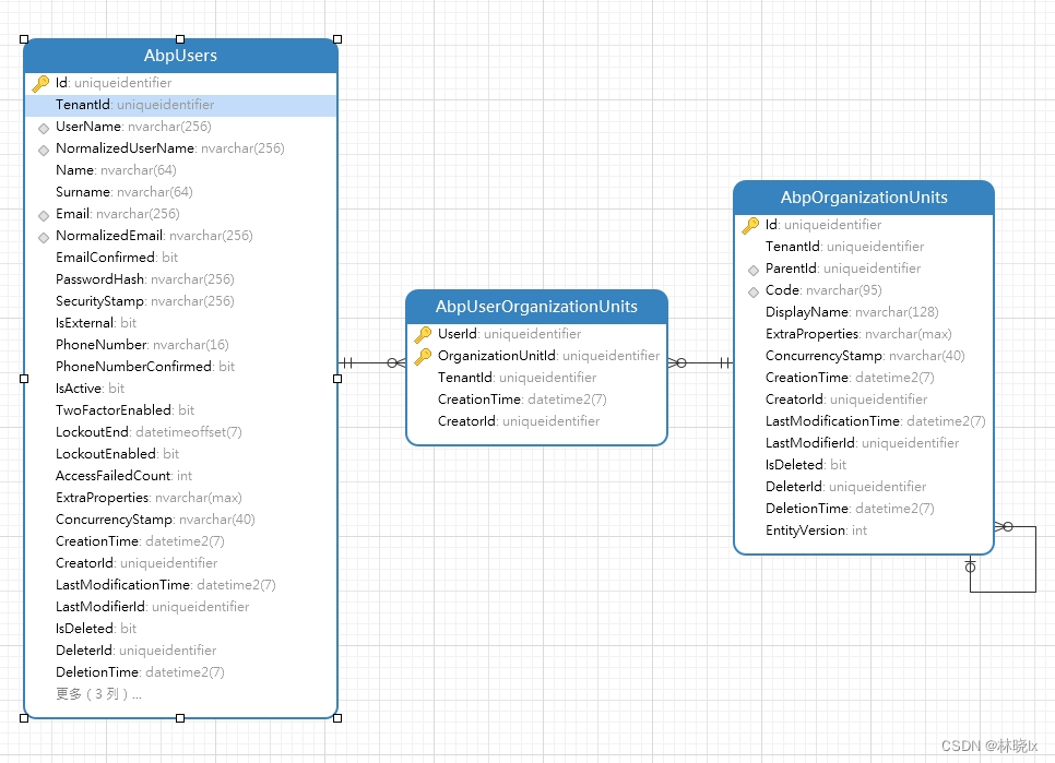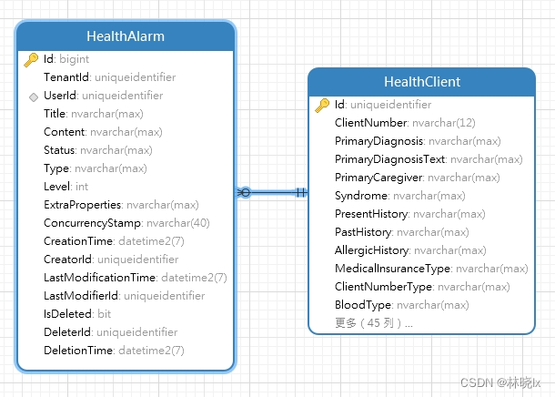 在Abp中,组织架构和用户是通过中间表AbpUserOrganizationUnits实现多对多的关系。模型如下图所示: 查询目标业务对象HealthAlarm关联了业务用户HealthClient,因业务用户与鉴权用户IdentityUser共享同一个Id,因此可以通过查询组织架构关联的User,查询到业务对象。