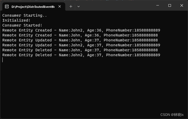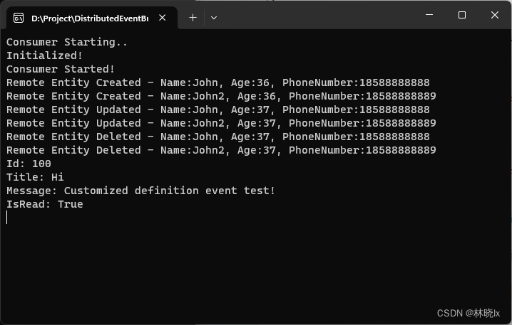 void IEventHandler<EntityCreatedEventData<Person>>.HandleEvent(EntityCreatedEventData<Person> eventData) { var person = eventData.Entity; Console.WriteLine($"Remote Entity Created - Name:{person.Name}, Age:{person.Age}, PhoneNumber:{person.PhoneNumber}");