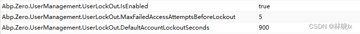 在AbpSettings表中配置开启用户登录失败锁定,并配置失败尝试次数和锁定时长
