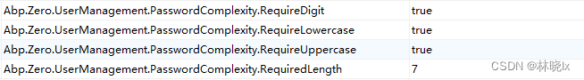 在AbpSettings表中配置开启PasswordComplexity密码复杂度校验,设置密码最小长度为7位