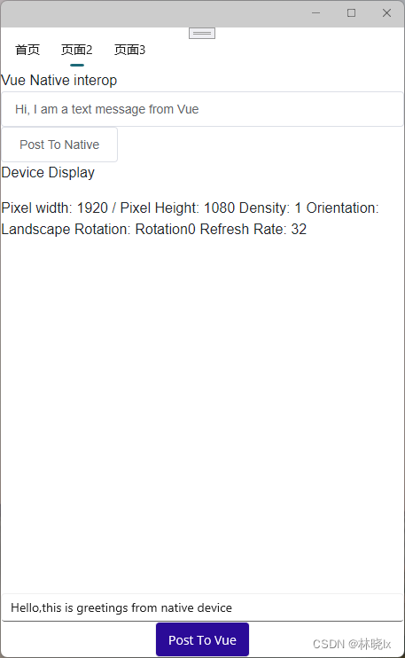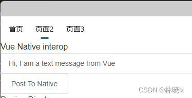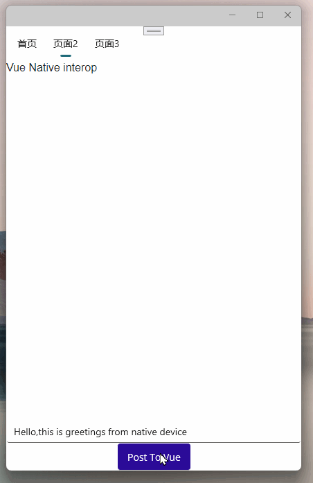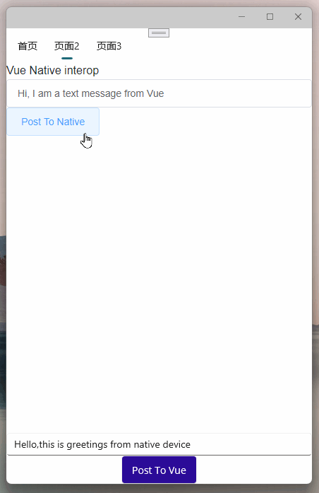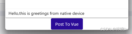 | <div id="vue-app"> {{ message }} <el-input v-model="input" placeholder="请输入内容"></el-input> <el-button @click="post">Post To Native</el-button> <el-dialog :visible.sync="showDialog" title="Native device msg recived!"> <p>{{msg}}</p> </el-dialog> </div>