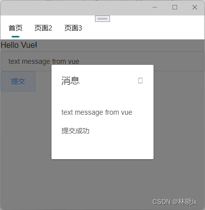 | <div id="vue-app"> {{ message }} <el-input v-model="input" placeholder="请输入内容"></el-input> <el-button @click="showDialog = true">提交</el-button> <el-dialog :visible.sync="showDialog" title="消息"> <p>{{input}}</p> <p>提交成功</p> </el-dialog> </div>