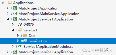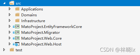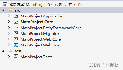 怎样将模型落地到项目中呢? 我们先来分析一下Abp官方生成项目中的目录结构。以“MatoProject”为命名空间从Abp官网生成一个原始项目,打开解决方案: