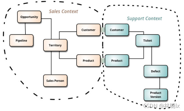 例如客户关系管理系统(CRM),交易记录子系统和客户支持子系统都会调用客户实体、产品实体的属性和数据。这样就产生了上下文边界, 而它们是隶属于各自不同上下文边界,如下图: