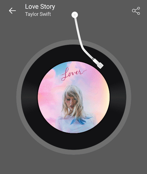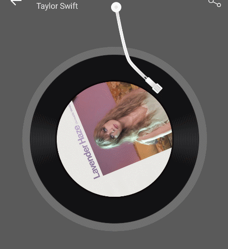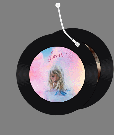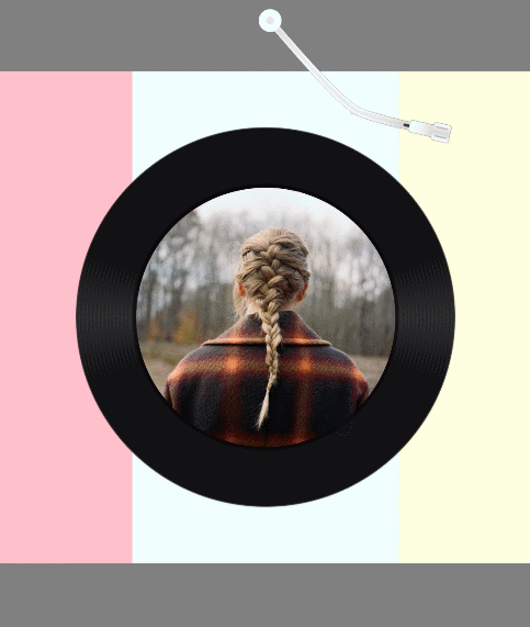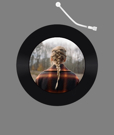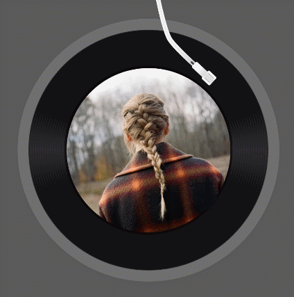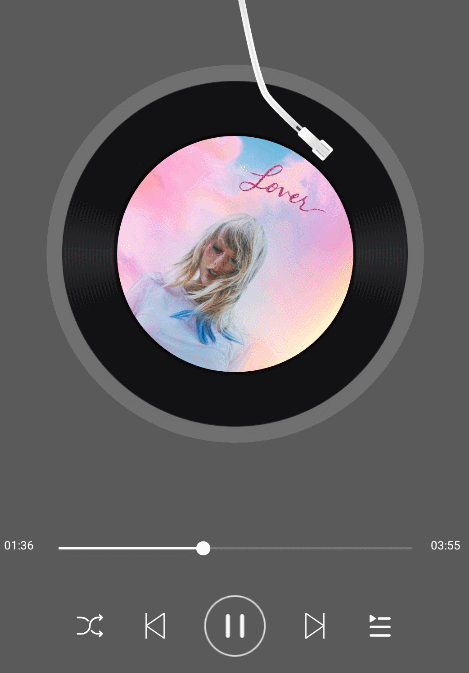 唱盘和唱针动画 唱盘转动,音乐随之播放,通过将专辑封面图片以20秒每圈的速度旋转来实现唱盘旋转的效果。
