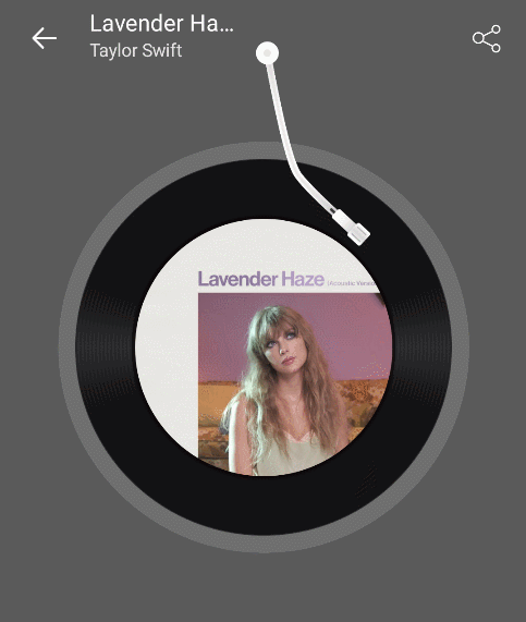 在音乐播放时 当手指开始滑动时,唱针从唱盘上移开,唱盘停止旋转; 当手指离开时,唱针回到唱盘上,唱盘继续旋转。