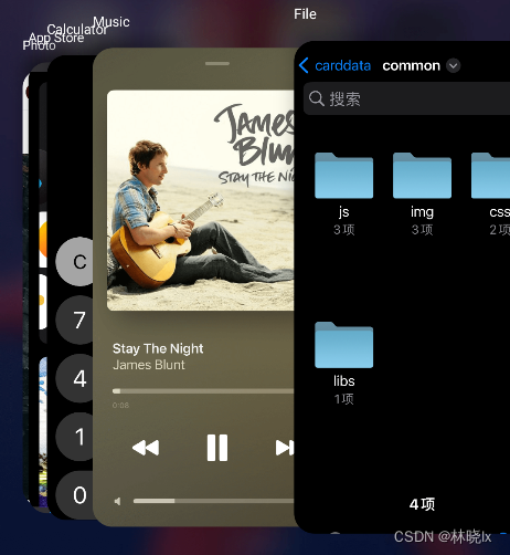 原理 使用过的App将以屏幕截图的卡片方式展现,卡片从右到左依次排列,最近使用的app卡片将靠前,并叠层在其他久未使用的app卡片之上。