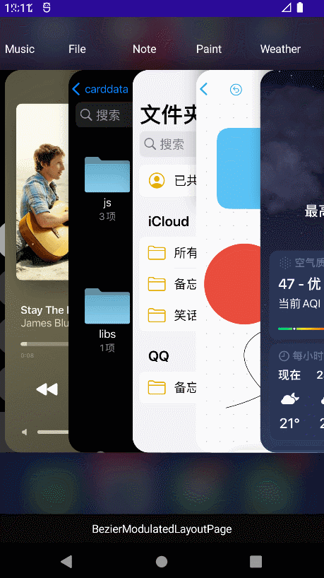 这个设计利用屏幕深度(z方向)和水平空间(x轴方向)的平顺结合,在有限的屏幕空间内,展现了更多的卡片,滑动屏幕时,每一个卡片在屏幕中央的时候也能得到大面积的展示。