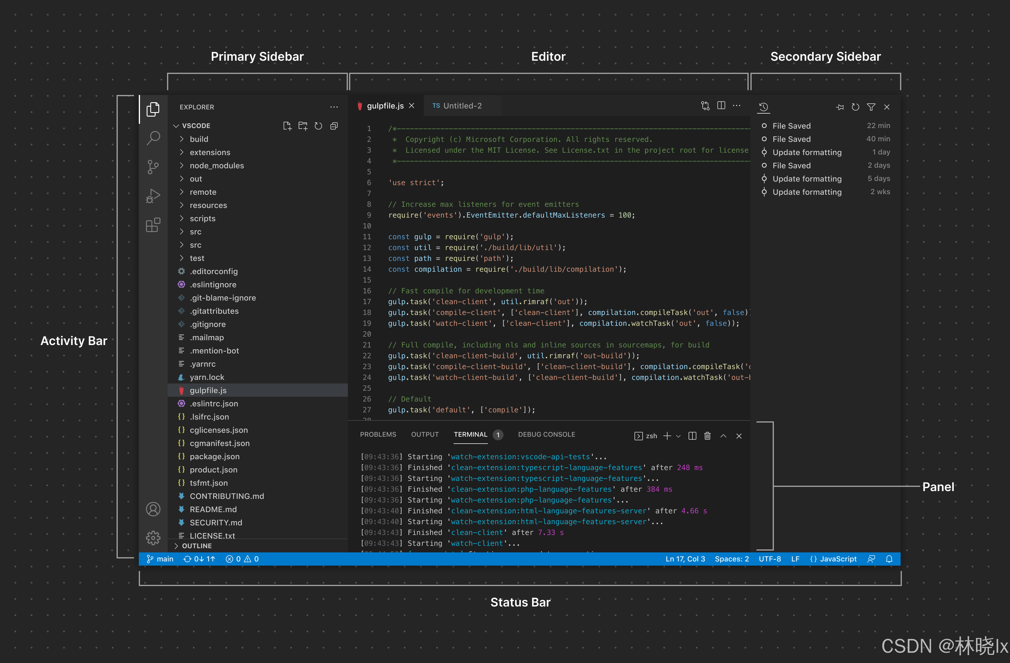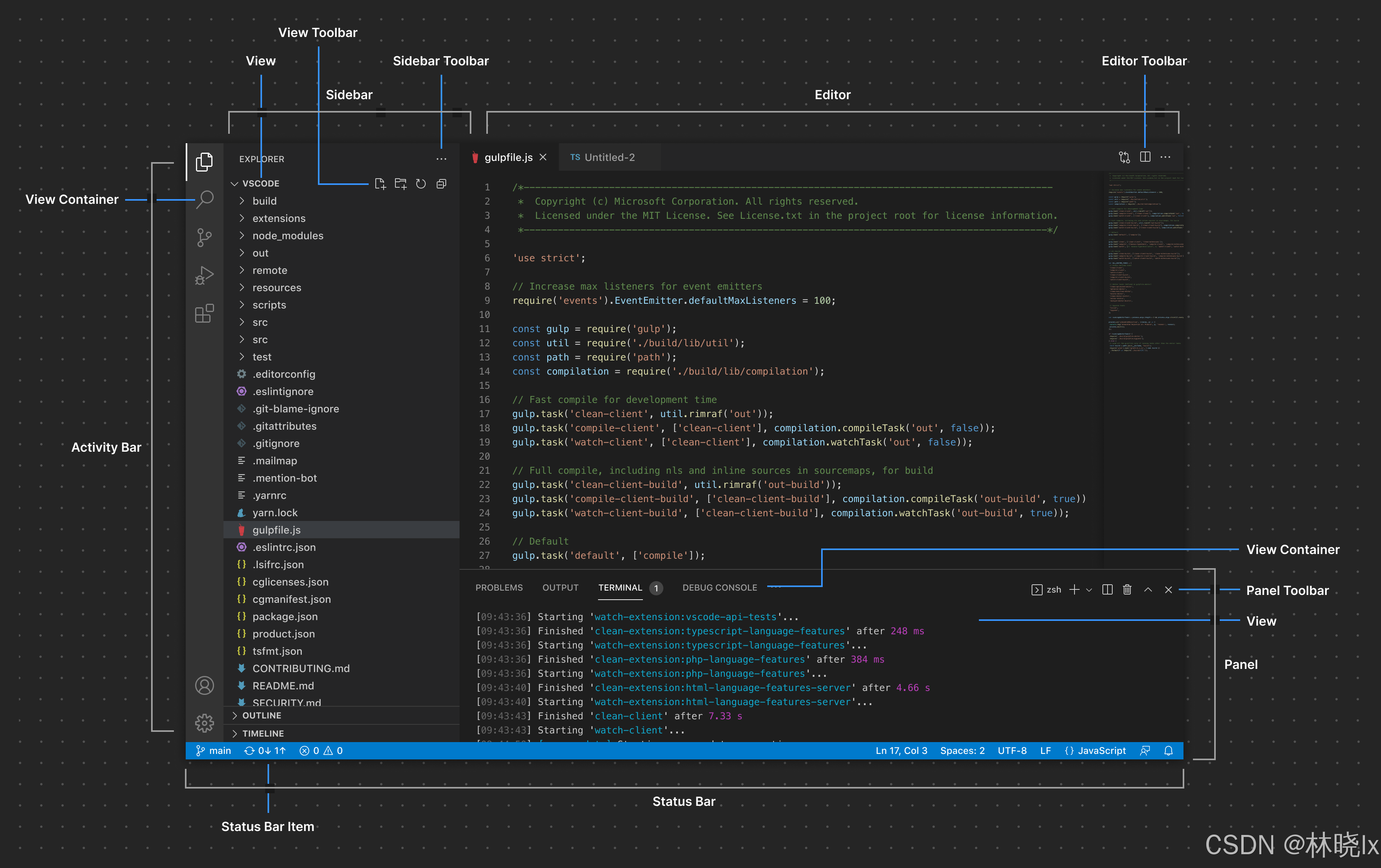 VS Code这些框架的部分,官方称之为“容器”,整个VS Code由6个容器组成,分别是:活动栏,主边栏,编辑器,辅边栏,面板,状态栏。