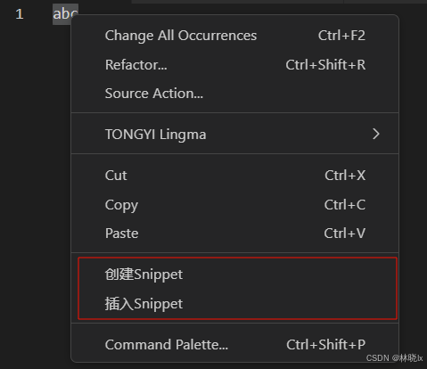 当编辑器中有文本被选中时,上下文菜单的“创建Snippet”会显示,点击时选中的文本将作为代码片段被存储。
