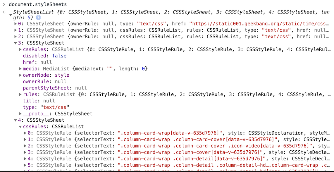 从图中可以看出,这个样式表包含了很多种样式,已经把那三种来源的样式都包含进去了。当然样式表的具体结构不是我们今天讨论的重点,你只需要知道渲染引擎会把获取到的CSS文本全部转换为styleSheets结构中的数据,并且该结构同时具备了查询和修改功能,这会为后面的样式操作提供基础