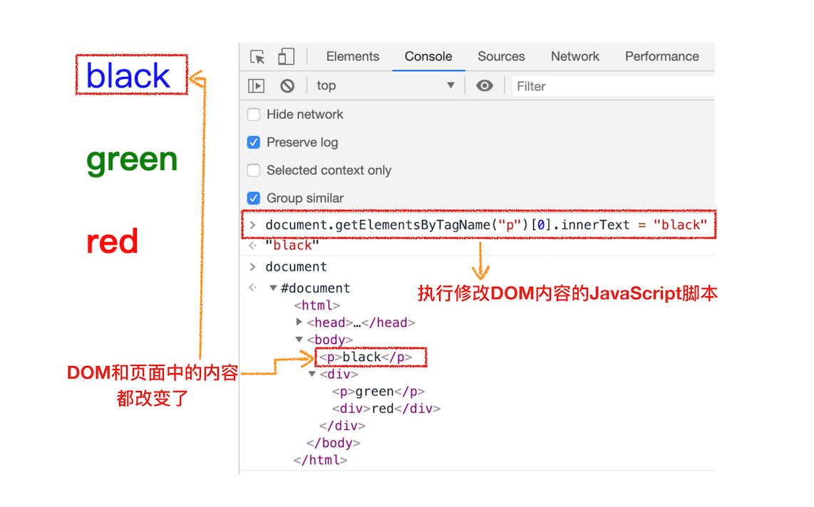 1 | document.getElementsByTagName("p")[0].innerText = "black" |