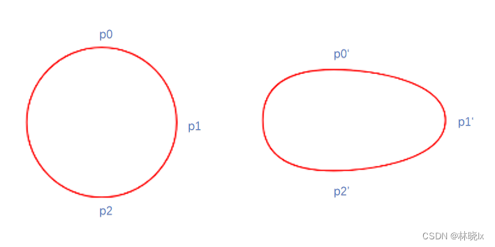 p0变换后的坐标为p0’,p1变换后的坐标为p1’,p2变换后的坐标为p2’。 变换前后的对比如下:
