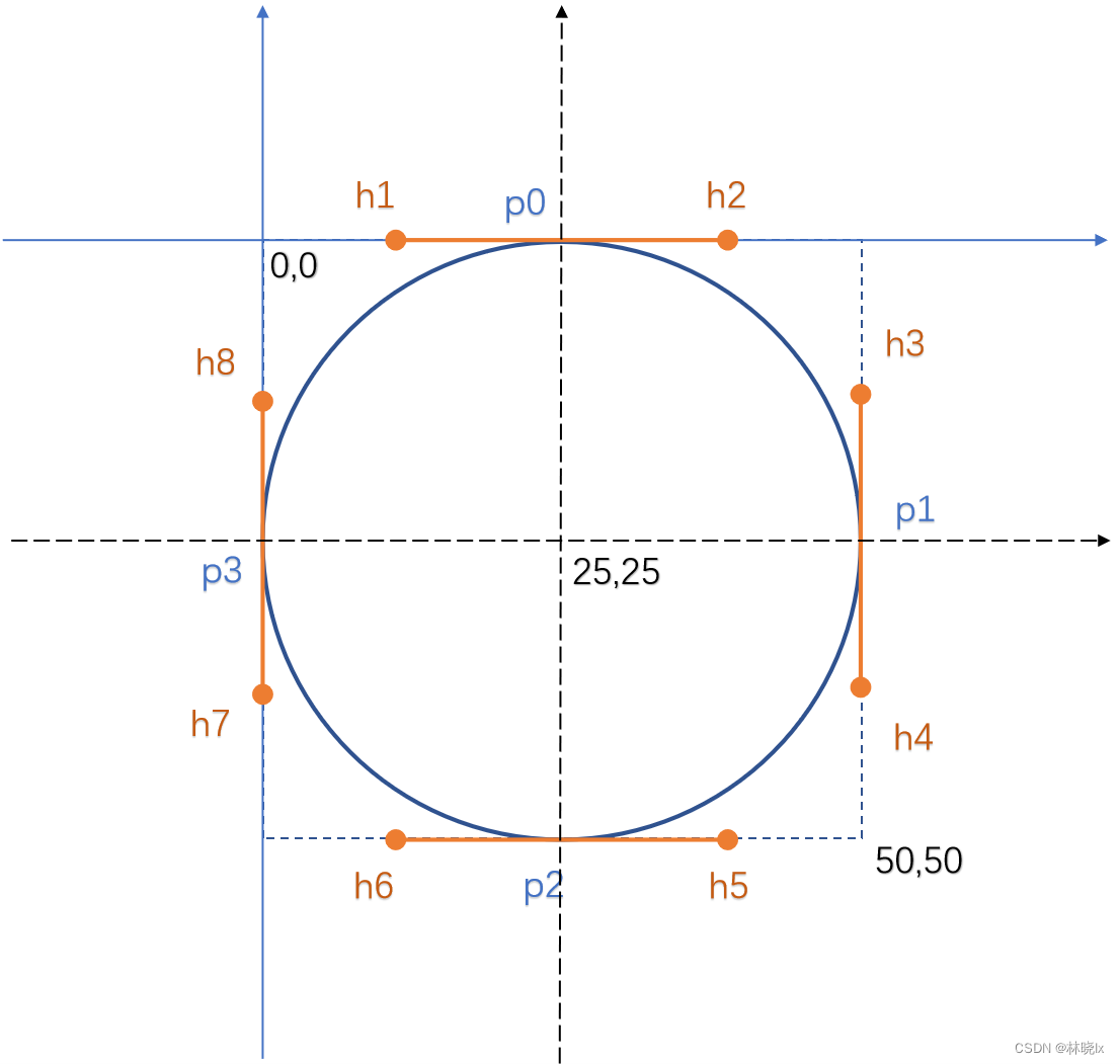 圆的大小为控件的宽高,圆心为控件的中心点。根据公式,我们计算出控制点的偏移量