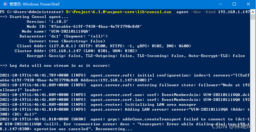打开命令行并输入consul.exe agent -dev -bind {你本机的ip地址} 来运行consul服务