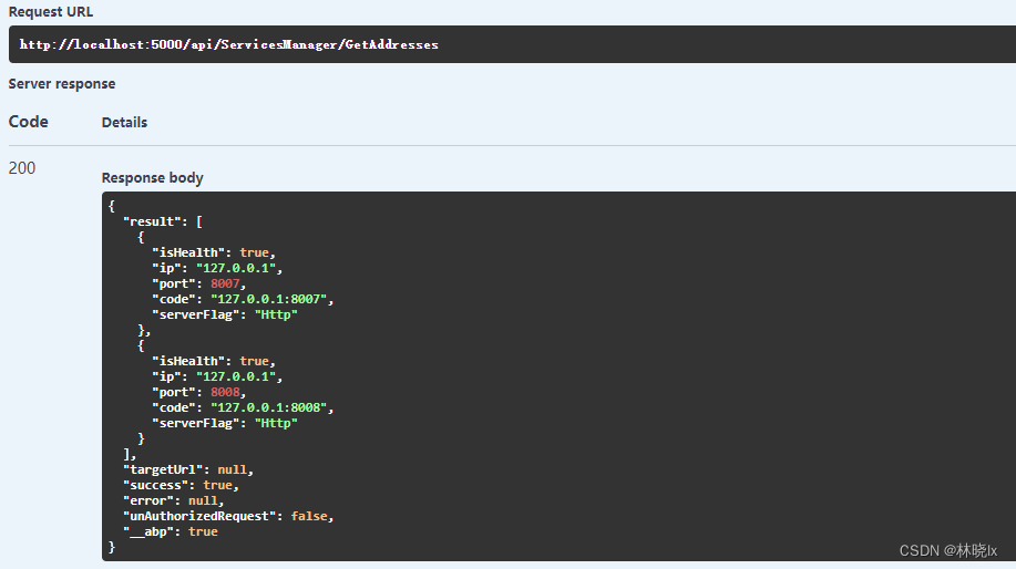 运行后关闭一个微服务,若关闭Service2,请求/api/ServicesManager/GetAddresses
