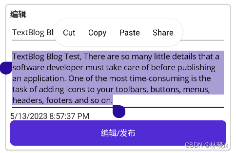 1 2 3 4 5 6 7 8 9 10 11 12 13 14 15 16 17 18 19 20 21 22 23 24 <ControlTemplate x:Key="BlogCardViewDesktop"> <Frame HasShadow="True" Margin="0,10,0,10" CornerRadius="5" Padding="8"> <FlyoutBase.ContextFlyout> <MenuFlyout> <MenuFlyoutItem Text="编辑" /> <MenuFlyoutItem Text="分享" /> <MenuFlyoutItem Text="删除" /> </MenuFlyout> </FlyoutBase.ContextFlyout> <VerticalStackLayout> <ContentPresenter /> <Label Text="{TemplateBinding BindingContext.PostTime}" FontFamily="FontAwesome"></Label> <Button Text="编辑/发布" Command="{TemplateBinding BindingContext.SwitchState}" /> </VerticalStackLayout> </Frame> </ControlTemplate>