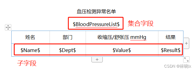 数据集合将以表格的形式呈现在文档中,因此你需要在模板中预留一个表格,Exporter将根据表中单元格的占位符,填充表格各列的内容。