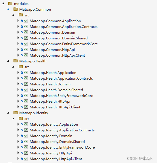 在解决方案目录中创建新目录src/modules,在该目录下创建员工健康管理模块Health,公共业务模块Common,以及扩展了Volo.Abp.Indentity的Identity模块