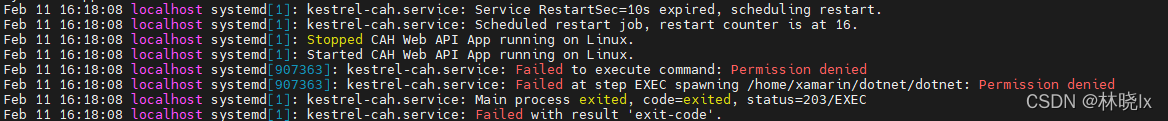 查询系统日志发现对dotnet访问没有权限,dotnet已设置权限755并且service的配置文件中User已配置为本人用户
